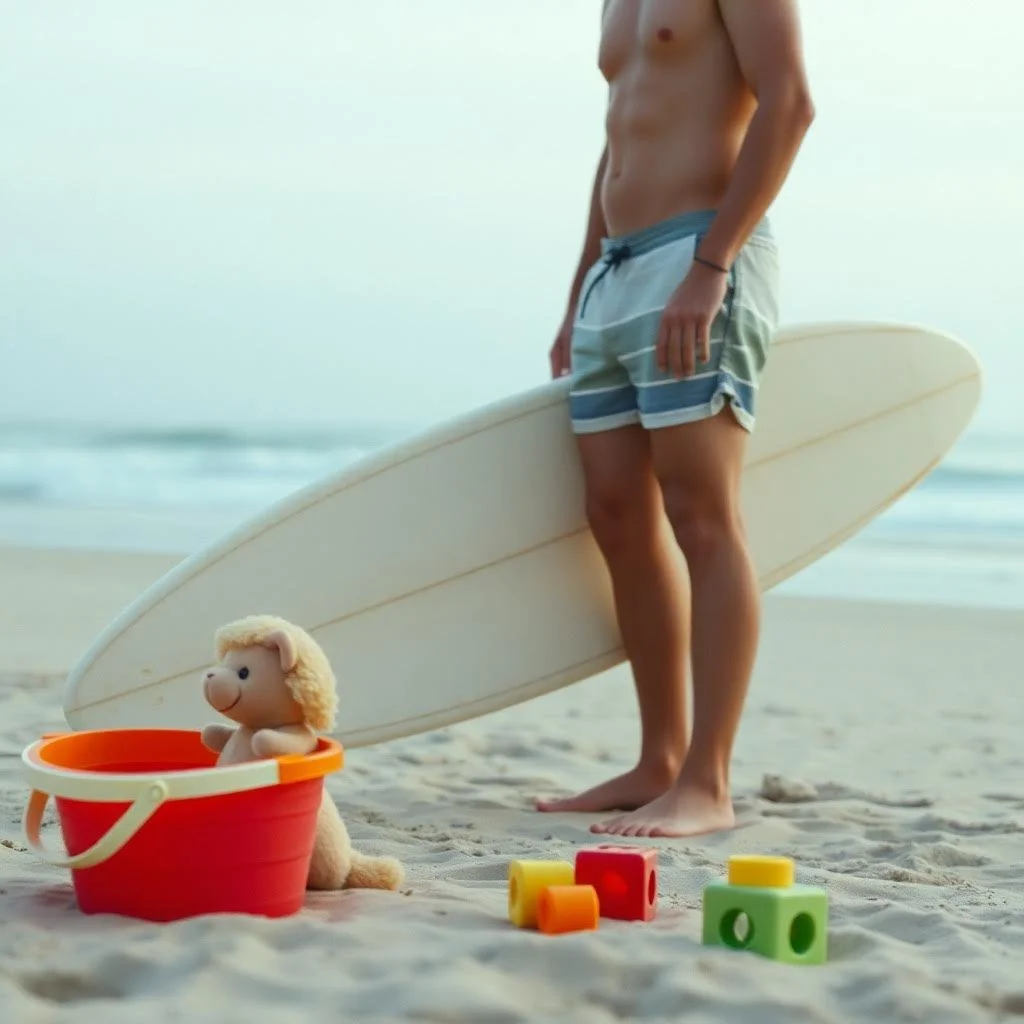 "You know what, little man?" Louis said, dropping his surfboard and approaching Mitchell with the casual confidence of someone who'd spent countless hours caring for his younger siblings. "Those shorts are totally cramping your style. Let's get you some air circulation."
