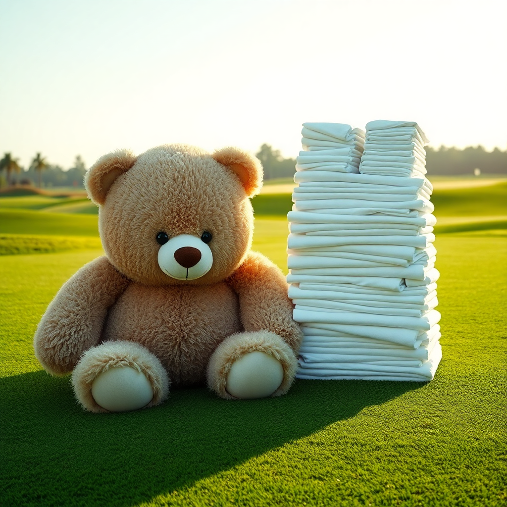 The playground becomes a sanctuary. A different bear this time - massive, soft, with fur that tells stories of a thousand cuddles. Mitchell approaches, Cookie Monster pampers bright against the green landscape, shirt slightly askew, pacifier a beacon of comfort.