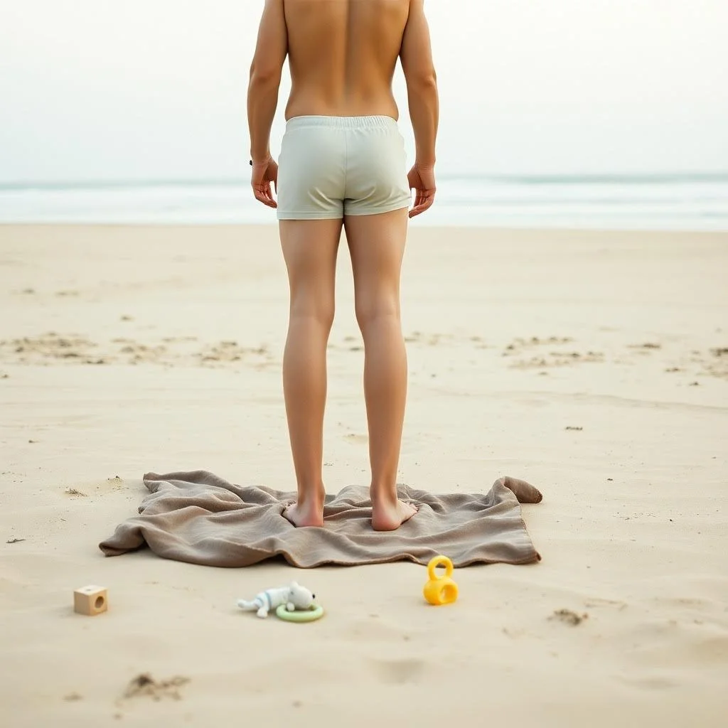 The beach is completely empty - just the two of them and about a million seagulls who are probably judging their life choices. Jake's still in his boxers, not giving a single care about proper beach attire, while Mitchell's pamper is doing its best impression of a sad, droopy diaper commercial.