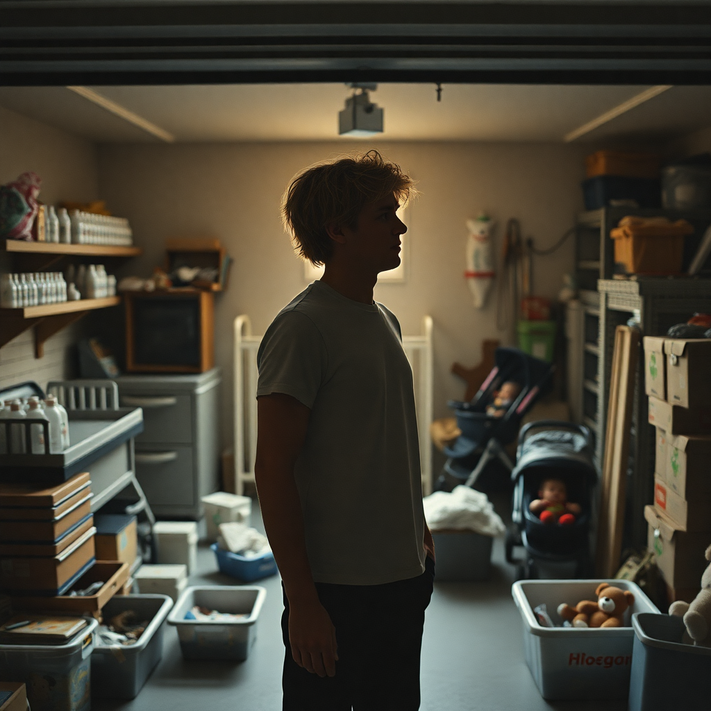 Finn's massive frame moved methodically through the garage, tools hanging like silent sentinels on pegboards. Sunlight filtered through dusty windows, casting long shadows across the concrete floor. The stroller's wheels rolled softly, Mitchell nestled inside like a tiny emperor of his own mechanical kingdom.
